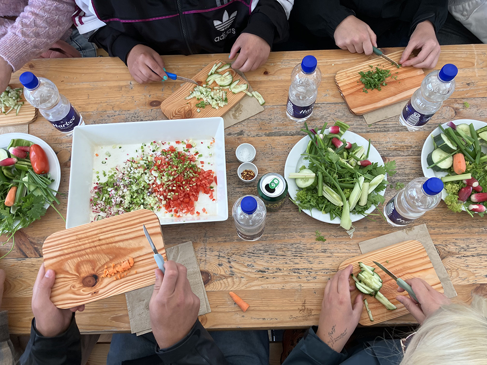 Vi afslutter med et suverænt og mættende fællesmåltid bestående af den frisksnittede salat.